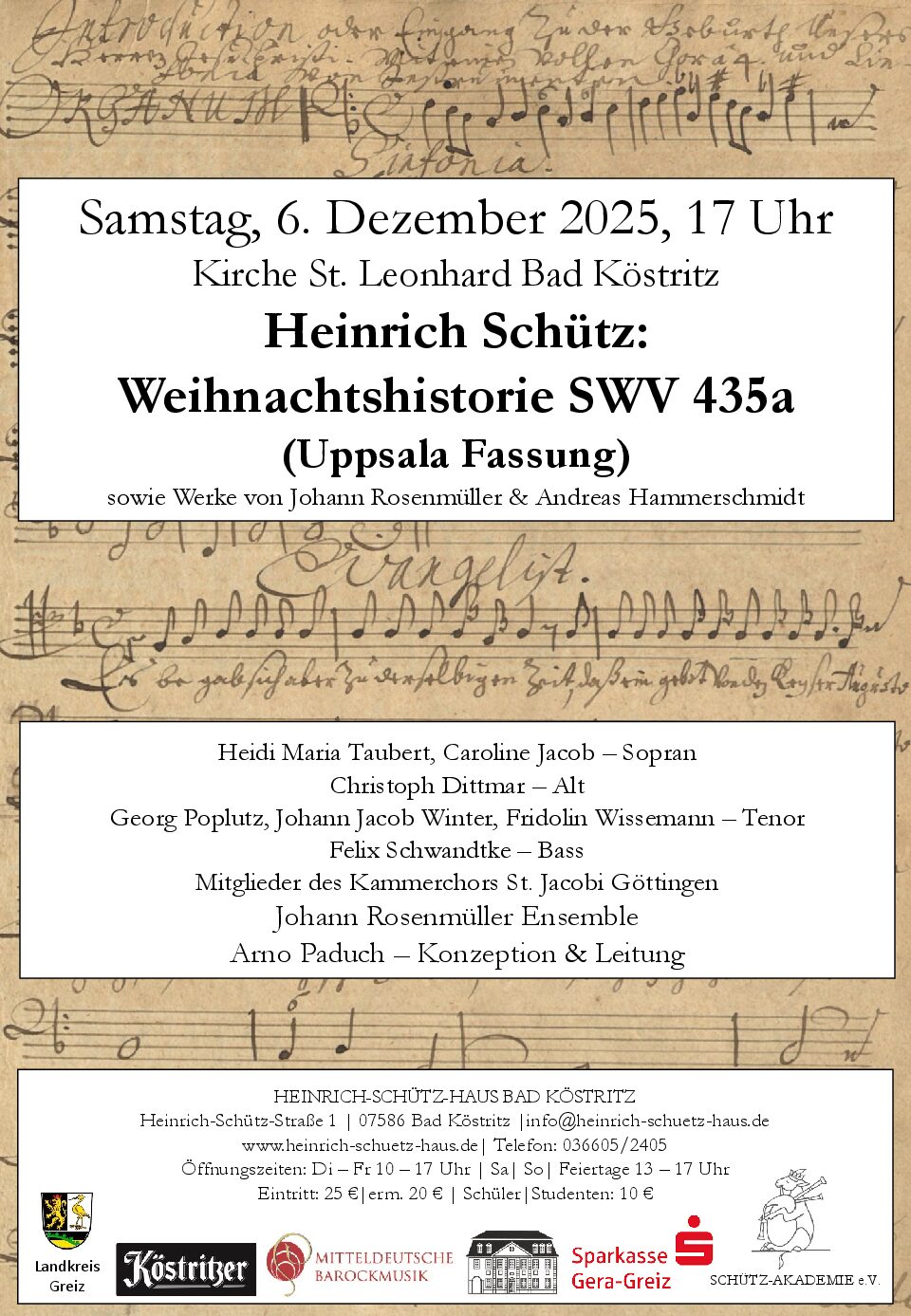 St. Leonhardskirche Bad Köstritz An d. Kirche 2, Bad KöstritzSamstag, den 6. Dezember 2025 um 17.00 Uhr in der St. Leonhardskirche zu Bad Köstritz Heinrich Schütz: Weihnachtshistorie SWV 435a (Uppsala Fassung) sowie Werke von Johann Rosenmüller und Andreas Hammerschmidt […]